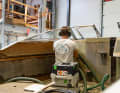 Aber auch in der Schlupfkabine wurde weitergearbeitet. Alveus fügte Längsstringer und eine neue Bodenwrange in den Bugbereich der Conquest ein. Bei den Stringern handelt es sich um Verstärkungen parallel zum Kiel, die die Steifigkeit des Rumpfes erhöhen. Zusammen mit den Spanten bilden sie das tragende Gerüst der Konstruktion. Auf diese Längsstringer aus Coosamaterial werden später auch die Auflageflächen für die Kojen montiert. Angeklebt und überlaminiert macht das einen guten Eindruck. Die so entstandenen Stauräume strich die Werft mit Epoxidprimer weiß aus. Sie bieten genügend Platz für Kleidung und Proviant. Auch die an die Rumpfform angepassten Matratzenauflager (ebenfalls aus Coosa) wurden in diesem Schritt gleich mitgebaut. Um später den gesamten vorderen Bereich als zusammenhängende Liegefläche nutzen zu können, wurde noch ein zusätzliches Mittelstück für die Lücke zwischen den Auflagern zu beiden Seiten hergestellt. So entsteht eine bequeme V-Koje für zwei Personen.