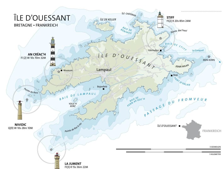 The island of Ouessant(BretonEnez Eusa,EnglishUshant)belongs to Brittany and lies a good ten nautical miles off the coast on the northern edge of the Bay of Biscay. The westernmost settlement in France - apart from the overseas departments - marks the western entrance to the English Channel, just like the Isles of Scilly on the opposite British side.